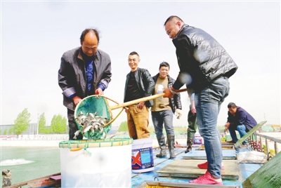 4月16日,南和區(qū)三思鎮(zhèn)后郭平村鱸魚養(yǎng)殖基地,農(nóng)民在放養(yǎng)30萬尾鱸魚苗。