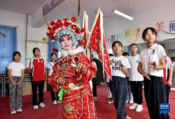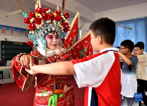 9月19日,威縣亂彈傳承人時(shí)敬華向白果樹中心小學(xué)學(xué)生傳授亂彈技藝。