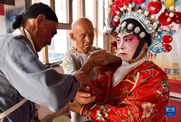 9月19日,威縣亂彈傳承人時(shí)敬華在排練前整理戲曲服飾。