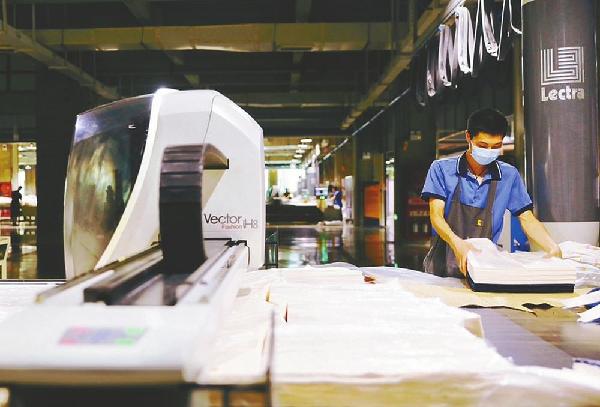 近日,在寧晉縣童泰嬰幼兒服飾有限公司的裁剪車間,工人在整理自動(dòng)化裁床裁剪的布料。