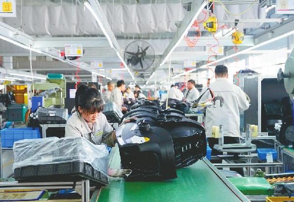 近日,在平鄉(xiāng)縣一家童車企業(yè),工人正在組裝童車趕制外貿(mào)訂單。