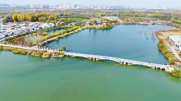 11月27日,記者沿鄉(xiāng)間小徑行至市經(jīng)開區(qū)王快鎮(zhèn)百泉社區(qū)、北廠社區(qū)交界處,記者看到在陽光照耀下,百泉湖面泛起點點波光。湖畔蘆花如浪,隨風(fēng)而蕩。周邊民居挨挨擠擠,鋪陳開去。這里儼然一片世外桃源。“這是我們家門口的百泉湖。”家住百泉社區(qū)的古稀老人魏安芹說。