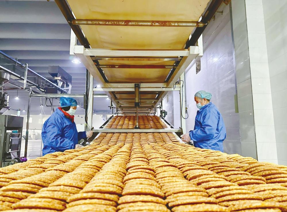 位于寧晉縣的河北麥客食品有限公司,工人正在餅干生產線上作業(yè)。胡盼玲攝