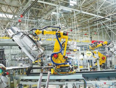 河北長(zhǎng)征汽車制造有限公司焊裝車間內(nèi),機(jī)械臂正在焊接新能源重卡零部件。韓文洲攝
