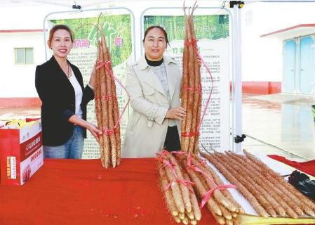 ③ 9月23日,在柏鄉(xiāng)縣慶?!爸袊r民豐收節(jié)”活動現(xiàn)場,農民展示收獲的麻山藥。黃濤、王光耀攝