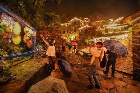 10月9日晚,信都區(qū)英談古寨燈火璀璨,游客漫步古巷,感受古村落韻味,沉醉于夜游的愜意時(shí)光。