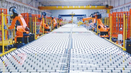 圖為沙河市安全實(shí)業(yè)有限公司1000t/d超厚高透特種玻璃生產(chǎn)線成品工段機(jī)械臂抓取玻璃產(chǎn)品。