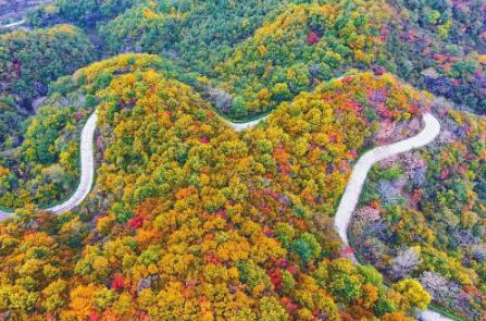 10月19日,無人機拍攝的臨城縣西部太行山區(qū)的蝎子溝國家森林公園。深秋時節(jié),蝎子溝國家森林公園紅黃綠葉交織如畫,層林盡染、五彩斑斕,形成美麗壯觀的醉人景觀。