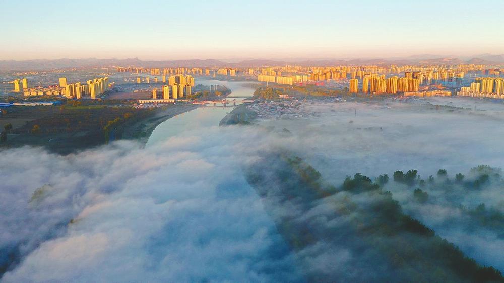 11月1日清晨,市區(qū)出現(xiàn)大規(guī)模平流霧,七里河河道和遠處的高樓大廈在霧氣中若隱若現(xiàn),云霧繚繞其間,仿佛為城市披上一層輕柔的薄紗。 韓文洲、李成行攝